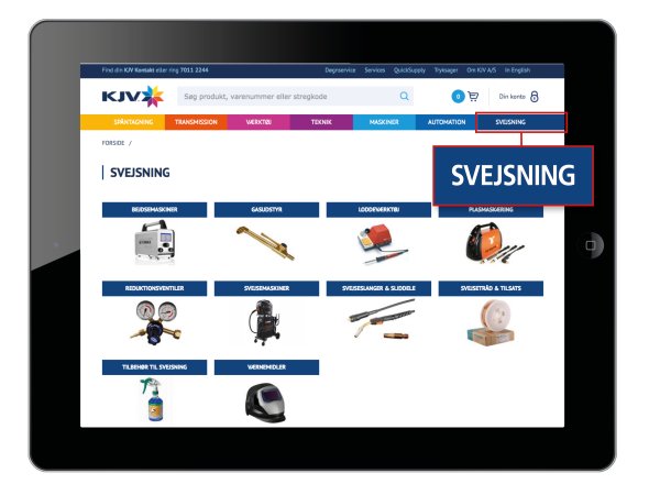 KJV har på hjemmesidens front tilføjet et selvstændigt menupunkt: 'Svejsning' øverst på siden. Klikker man her, kommer man til en oversigtside, hvor svejseudstyret er opdelt i ti kategorier, blandt andet svejsemaskiner, bejdsemaskiner, gasudstyr, svejseslanger og sliddele, tilsats, tilbehør og værnemidler. Fra denne oversigt kan man så klikke sig videre til yderligere oversigter.