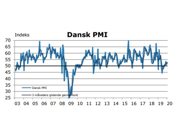 Det sæsonkorrigerede indeks for Dansk PMI endte på 53,2 i januar. Det var en fremgang på 2,1 point sammenlignet med december måneds PMI, der endte på 51,1.