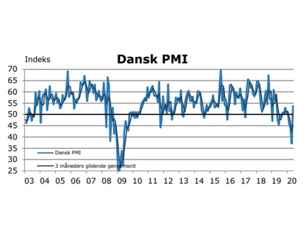 Det sæsonkorrigerede indeks for Dansk PMI steg betydeligt i maj måned, og endte på 54,0. Det var en stigning på 16,8 point sammenlignet med forrige måned, og dermed er Dansk PMI nu igen over det neutrale 50,0-punkt.
