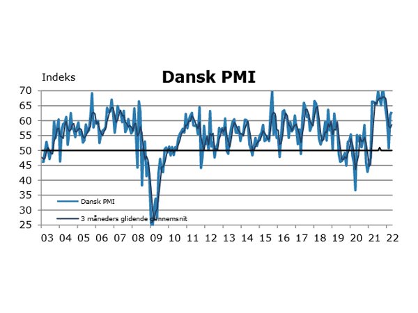 Dansk PMI oplevede i april en yderligere stigning fra marts måned på 1,1 procentpoint, og endte dermed på sæson korrigeret indeks 63,0. PMI indikerede fortsat klar vækst inden for den danske industri.