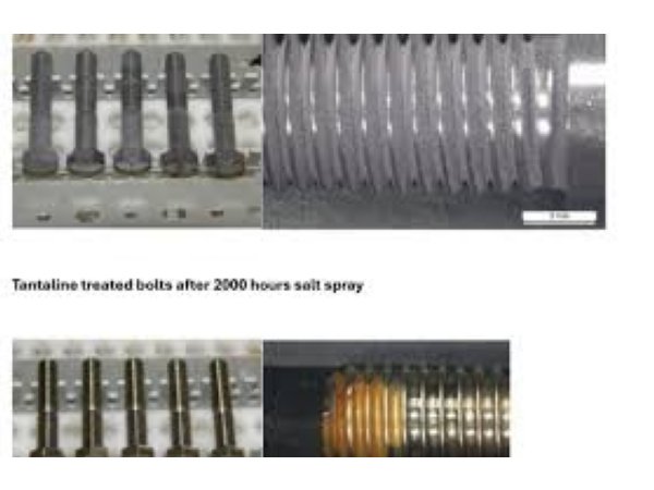 • De aktuelle tests med Tantaline-behandlede bolte til brug i marine- og offshore-sektorerne viste gode resultater ved saltvandstests.