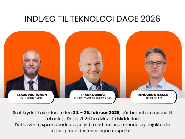 De tre faglige indlæg, som er en del af Teknologi Dage 2026, ved Mazak i Middelfart 24. og 25. februar, er nu kommet helt på plads.